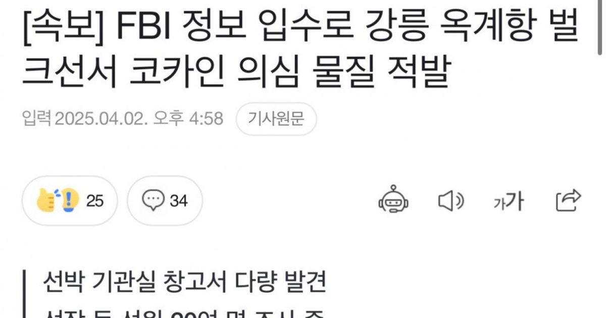 FBI 첩보 받아 강릉 선박서 코카인 추정 마약 대량 ...